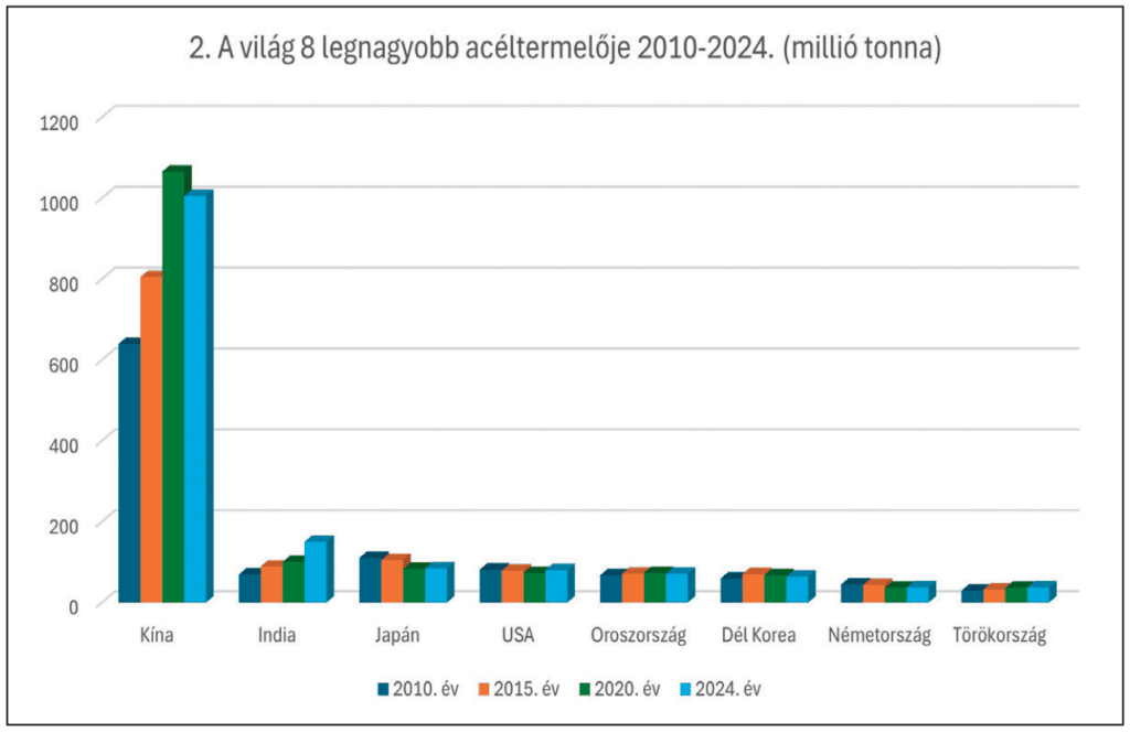 Azt látjuk, hogy húsz év alatt a világ acéltermelése majdnem megduplázódott. Ez a övekedés gyakorlatilag egymagában Kínához köthető, amelyhez az utóbbi években csatlakozik India is. A világ maradékának – bármilyen csúnya szó, itt helytállónak tűnik – a termelése pedig csökken vagy stagnál. Ázsia, Kína és a feltörekvő India nyomasztó acélipari dominanciával magasodik fölénk.